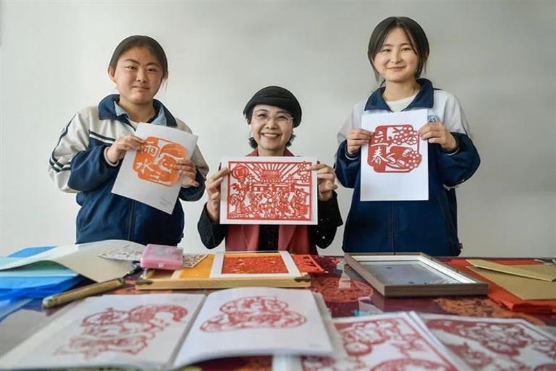 中卫市剪纸非遗传承人买元花(中)和海原县职业技术学校学生展示非遗剪纸作品。