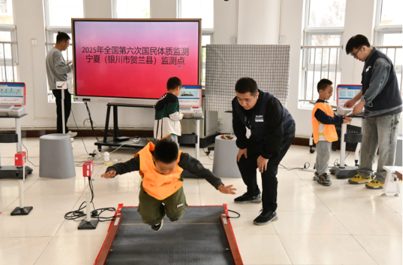 5月7日, 贺兰县金贵镇幼儿园,小朋友在进行立定跳远测试。当天,2025年全国第六次国民体质监测团队进入贺兰县,开展体质测试。监测现场,小朋友们在测试队员和老师的引导下,顺利完成各个项目的测试。这是5年一次的全国国民体质监测首次覆盖至贺兰县乡村幼儿园。记者 王刚 摄