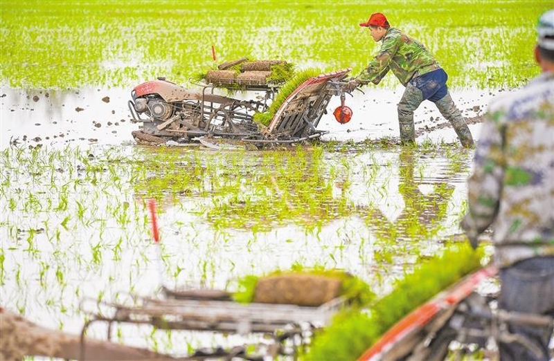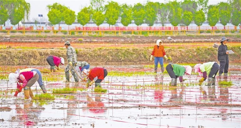5月14日,宁夏稻渔空间乡村生态观光园内,农民抢抓农时,开展种植、管护等农事活动。稻渔空间创新“稻田养蟹”“农旅融合”模式,既提升土地综合效益,又打造出“水田映霞、稻浪千重”的观光盛景。今年,贺兰县通过“党支部+合作社+农户”联动机制,已培育新型职业农民千余人,机械化插秧覆盖率达85%。记者 马楠 王洋 摄