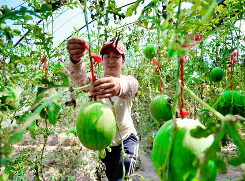 5月19日,在银川市金凤区良田镇园林村的大棚里,农户正在采摘吊瓜。该村通过“吊蔓栽培+人工传粉+膜下滴灌”的科学种植体系,让吊瓜实现了产量与品质的双重突破。今年全村种植吊瓜棚超120栋,预计带动农户户均增收数万元。近年来,该村累计建设温棚1120余栋,占地面积3300余亩,村集体收入突破百万元。 记者 马楠 王洋 摄