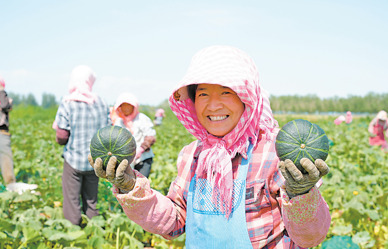 7月3日,贺兰县立岗镇3000亩贝贝南瓜迎来丰收,农户们忙着采收。瓜田里,墨绿色的南瓜掩映在藤蔓间,个头匀称,长势喜人。头茬南瓜亩产2000公斤左右,已于6月25日开始订购,销往海南、广东、福建等地。 宁夏日报报业集团全媒体记者 王若英 摄