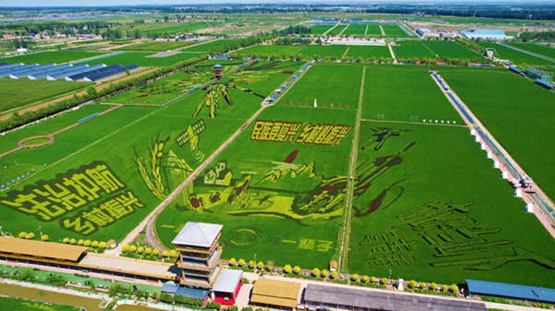 这是7月21日在稻渔空间乡村生态观光园拍摄的巨幅稻田画(无人机照片)。时下,正值水稻孕穗期,在贺兰县稻渔空间乡村生态观光园,题材多样的巨幅稻田画进入最佳观赏期,吸引不少游客前来观赏。记者 左鸣远 摄