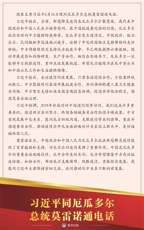 新华社北京6月16日电 国家主席习近平6月16日晚同厄瓜多尔总统莫雷诺通电话。