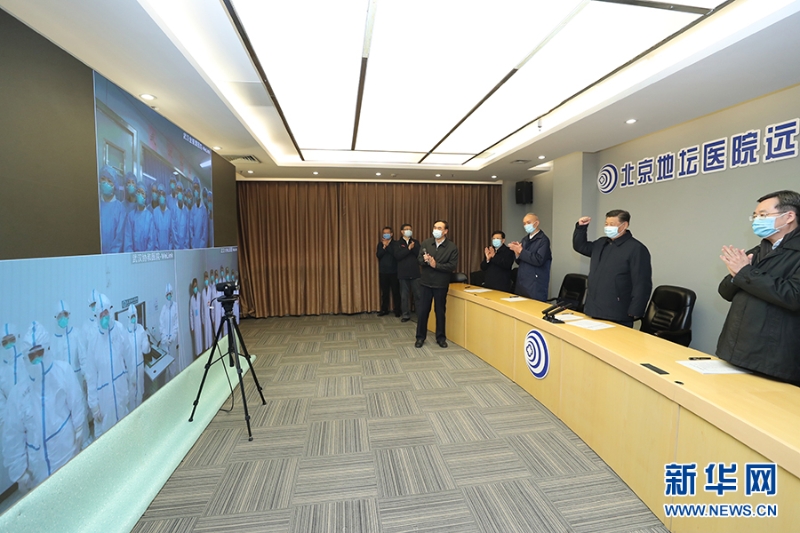 2月10日,习近平在北京调研指导新冠肺炎疫情防控工作。这是习近平在首都医科大学附属北京地坛医院远程诊疗中心,通过视频连线武汉市收治新冠肺炎患者的金银潭医院、协和医院、火神山医院,了解情况、听取意见和建议,慰问一线医务工作者。 新华社记者 鞠鹏 摄