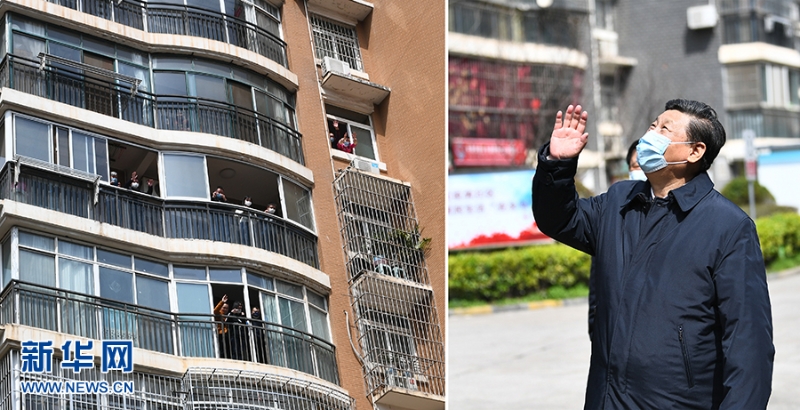 3月10日,习近平专门赴湖北省武汉市考察新冠肺炎疫情防控工作。这是习近平在东湖新城社区考察时,向在家隔离居住的居民挥手致意、表示慰问(拼版照片)。 新华社记者 谢环驰 摄