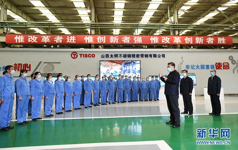 5月11日至12日,习近平在山西考察。这是5月12日上午,习近平在太钢不锈钢精密带钢有限公司生产车间考察时,同企业职工亲切交流。 新华社记者 谢环驰 摄