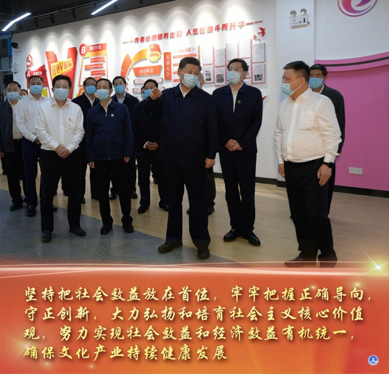 离开园区时,习近平总书记强调:“文化产业既有意识形态属性,又有市场属性,但意识形态属性是本质属性。刚才我看到你们墙上挂着一幅字‘导向金不换’,也可以引用来说明这样一个道理。一定要牢牢把握正确导向,坚持守正创新,确保文化产业持续健康发展。”