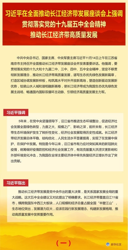 习近平指出,推动长江经济带发展是党中央作出的重大决策,是关系国家发展全局的重大战略。这次五中全会建议又对此提出了明确要求。长江经济带覆盖沿江11省市,横跨我国东中西三大板块,人口规模和经济总量占据全国“半壁江山”,生态地位突出,发展潜力巨大,应该在践行新发展理念、构建新发展格局、推动高质量发展中发挥重要作用。