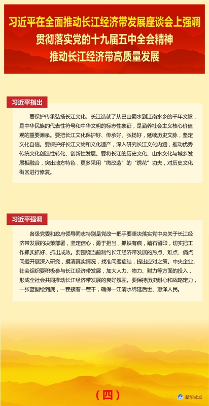 习近平指出,要保护传承弘扬长江文化。长江造就了从巴山蜀水到江南水乡的千年文脉,是中华民族的代表性符号和中华文明的标志性象征,是涵养社会主义核心价值观的重要源泉。要把长江文化保护好、传承好、弘扬好,延续历史文脉,坚定文化自信。要保护好长江文物和文化遗产,深入研究长江文化内涵,推动优秀传统文化创造性转化、创新性发展。要将长江的历史文化、山水文化与城乡发展相融合,突出地方特色,更多采用“微改造”的“绣花”功夫,对历史文化街区进行修复。