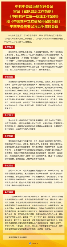 新华社北京11月30日电 中共中央政治局11月30日召开会议,审议《军队政治工作条例》、《中国共产党统一战线工作条例》、《中国共产党党员权利保障条例》。中共中央总书记习近平主持会议。