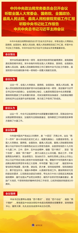 会议强调,今年是中国共产党成立100周年,是“十四五”开局之年。站在“两个一百年”奋斗目标的历史交汇点上,既要充满信心,也要居安思危。全国人大常委会、国务院、全国政协、最高人民法院、最高人民检察院党组要以习近平新时代中国特色社会主义思想为指导,全面贯彻党的十九大和十九届二中、三中、四中、五中全会精神,增强“四个意识”、坚定“四个自信”、做到“两个维护”,善于从政治上认识问题、推动工作,不断提高政治判断力、政治领悟力、政治执行力,始终在思想上政治上行动上同以习近平同志为核心的党中央保持高度一致。要胸怀中华民族伟大复兴战略全局和世界百年未有之大变局,牢牢把握“国之大者”,锚定党中央擘划的宏伟蓝图,观大势、谋全局、抓大事,坚持底线思维,保持战略定力,勇于担当作为,增强斗争精神,认真做好各项工作。要按照新时代党的建设总要求,以党的政治建设为统领,带头执行中央八项规定及其实施细则精神,履行全面从严治党主体责任,锲而不舍抓好党风廉政建设,激励广大党员、干部保持良好精神状态和工作状态,以优异成绩庆祝建党100周年。