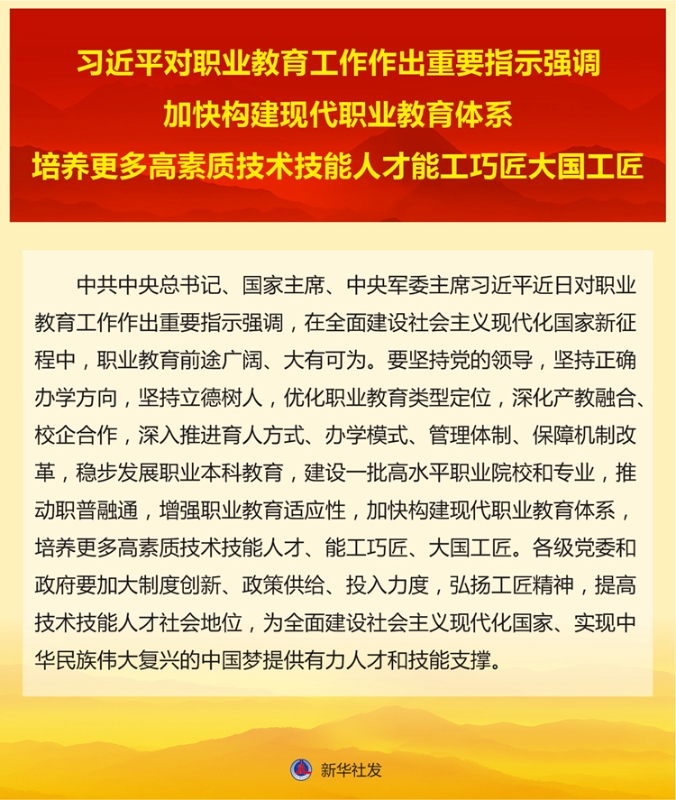 新华社北京4月13日电中共中央总书记、国家主席、中央军委主席习近平近日对职业教育工作作出重要指示强调,在全面建设社会主义现代化国家新征程中,职业教育前途广阔、大有可为。要坚持党的领导,坚持正确办学方向,坚持立德树人,优化职业教育类型定位,深化产教融合、校企合作,深入推进育人方式、办学模式、管理体制、保障机制改革,稳步发展职业本科教育,建设一批高水平职业院校和专业,推动职普融通,增强职业教育适应性,加快构建现代职业教育体系,培养更多高素质技术技能人才、能工巧匠、大国工匠。各级党委和政府要加大制度创新、政策供给、投入力度,弘扬工匠精神,提高技术技能人才社会地位,为全面建设社会主义现代化国家、实现中华民族伟大复兴的中国梦提供有力人才和技能支撑。