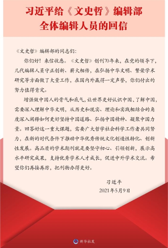 新华社北京5月10日电 中共中央总书记、国家主席、中央军委主席习近平5月9日给《文史哲》编辑部全体编辑人员回信,对办好哲学社会科学期刊提出殷切期望。