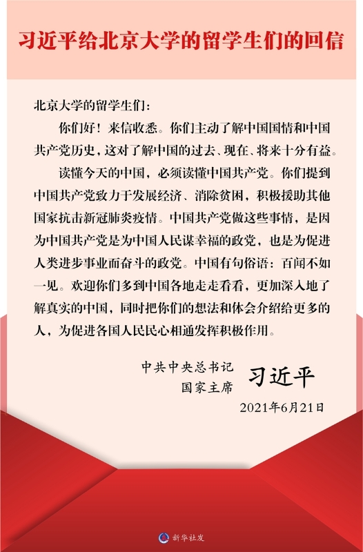 新华社北京6月22日电 中共中央总书记、国家主席习近平6月21日给北京大学的留学生们回信,鼓励他们更加深入地了解真实的中国,把想法和体会介绍给更多的人,为促进各国人民民心相通发挥积极作用。