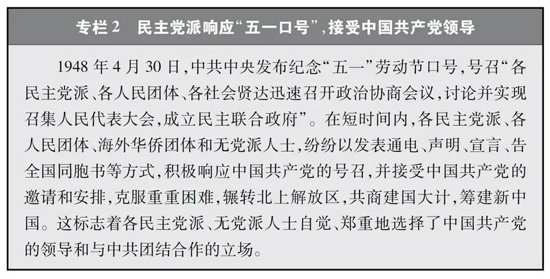 中国新型政党制度形成于协商筹建新中国的伟大实践。1948年4月,中国共产党发布纪念“五一”劳动节口号,提出召开政治协商会议、成立民主联合政府的主张,得到各民主党派、无党派人士和社会各界热烈响应,标志着各民主党派、无党派人士公开自觉接受中国共产党的领导,揭开了中国共产党同各党派、各团体、各族各界人士协商建国的序幕,奠定了中国共产党领导的多党合作和政治协商制度的基础。1949年9月,中国人民政治协商会议第一届全体会议召开,通过《中国人民政治协商会议共同纲领》,规定:在普选的全国人民代表大会召开以前,由中国人民政治协商会议的全体会议执行全国人民代表大会的职权。在普选的全国人民代表大会召开以后,中国人民政治协商会议得就有关国家建设事业的根本大计及其他重要措施,向全国人民代表大会或中央人民政府提出建议案。中国新型政党制度由此确立。