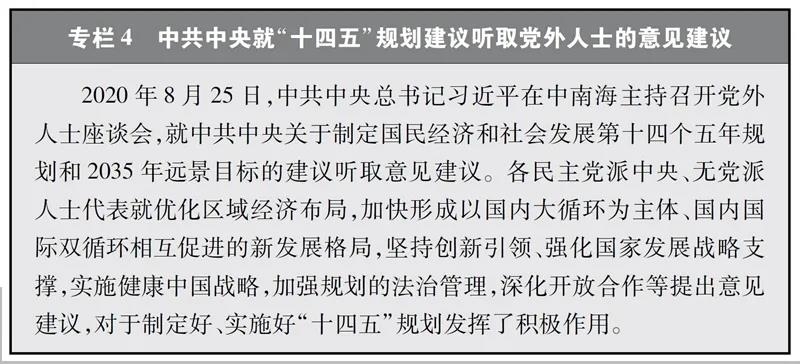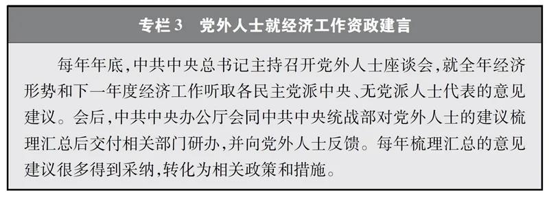 围绕国家方针政策的制定和重大战略的实施献计出力。就国家政治、经济、社会生活中的全局性、战略性、前瞻性重大问题开展考察调研,提出意见建议,是各民主党派、无党派人士发挥作用的重要渠道。多年来,各民主党派中央、无党派人士围绕“一带一路”建设、京津冀协同发展、长江经济带发展、粤港澳大湾区建设、长三角一体化发展、创新驱动引领高质量发展、推进供给侧结构性改革等关系国计民生的重大问题深入考察调研,向中共中央、国务院提出的许多意见建议被采纳。中国共产党积极完善知情明政机制、考察调研机制、工作联系机制、协商反馈机制,为各民主党派、无党派人士知情出力创造条件。
