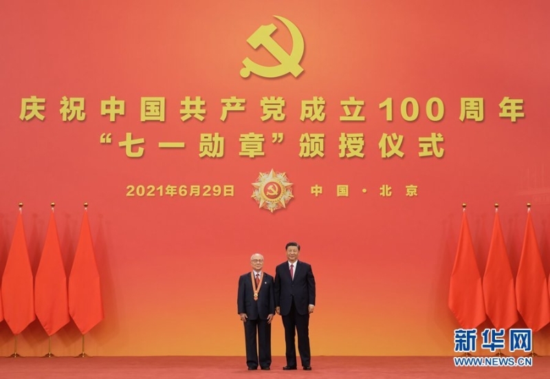 6月29日,庆祝中国共产党成立100周年“七一勋章”颁授仪式在北京人民大会堂金色大厅隆重举行。中共中央总书记、国家主席、中央军委主席习近平向“七一勋章”获得者周永开颁授勋章。新华社记者 李学仁 摄