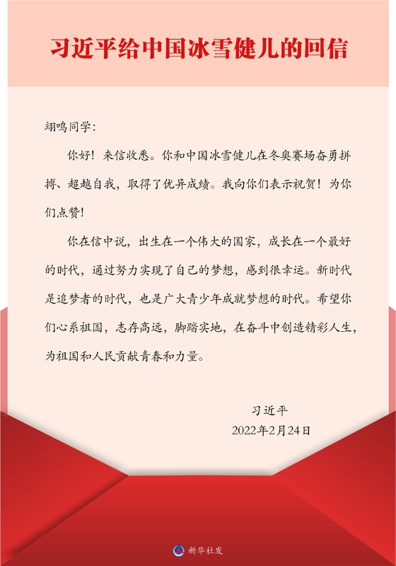 你好!来信收悉。你和中国冰雪健儿在冬奥赛场奋勇拼搏、超越自我,取得了优异成绩。我向你们表示祝贺!为你们点赞!