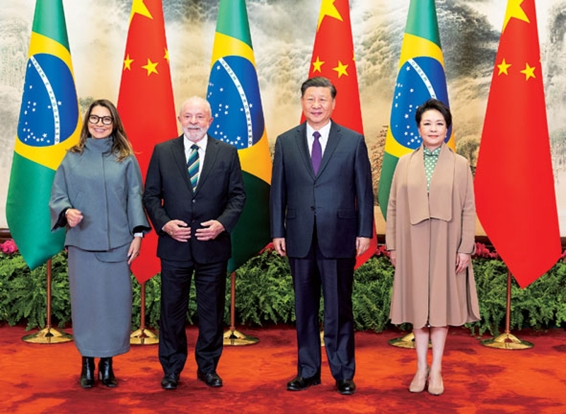 4月14日下午,国家主席习近平在北京人民大会堂同来华进行国事访问的巴西总统卢拉举行会谈。这是会谈前,习近平和夫人彭丽媛同卢拉和夫人罗桑热拉合影。新华社记者黄敬文摄