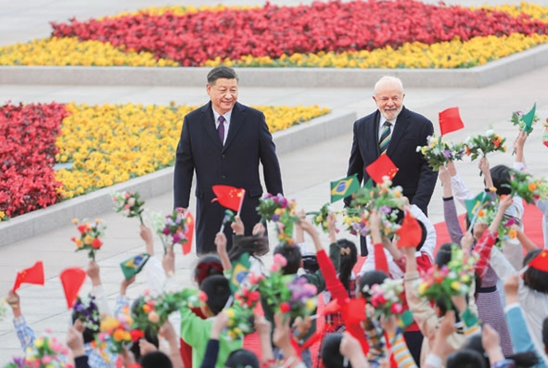 4月14日下午,国家主席习近平在北京人民大会堂同来华进行国事访问的巴西总统卢拉举行会谈。这是会谈前,习近平在人民大会堂东门外广场为卢拉举行欢迎仪式。新华社记者丁海涛摄