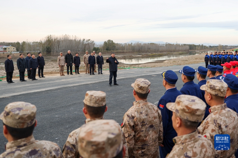 11月10日,中共中央总书记、国家主席、中央军委主席习近平在北京、河北考察灾后恢复重建工作。这是10日下午,习近平在河北保定涿州市白沟河治理工程(涿州段)考察时,同水利工程建设人员和曾经参加涿州抗洪救援的解放军和武警部队官兵、民兵预备役人员、消防救援队伍等方面的代表亲切交流。新华社记者岳月伟 摄