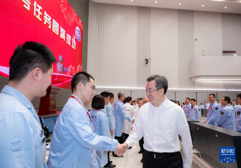 中共中央政治局常委、国务院副总理丁薛祥在北京航天飞行控制中心观看嫦娥六号任务返回器着陆回收情况。