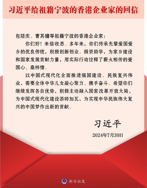 新华社北京8月1日电 近日,国家主席习近平给包陪庆、曹其镛等祖籍宁波的香港企业家回信,对他们予以亲切勉励。