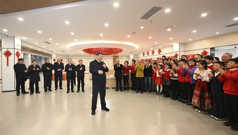 社区党群服务中心里,一些社区居民在写春联,孩子们编着中国结。习近平来到他们中间,不时赞赏他们的作品,勉励他们更好传承弘扬中华优秀传统文化。习近平还饶有兴致地欣赏了社区退休人员表演的笛子合奏曲。他深情地对大家说,过好春节意味着新一年有一个好的开端,家家户户幸福生活、老老少少开心快乐,就是人间美景。我们要一起努力,让这美景越来越靓丽。