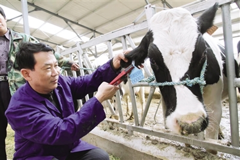 在奶牛养殖园区,工人正在为奶牛打耳标。