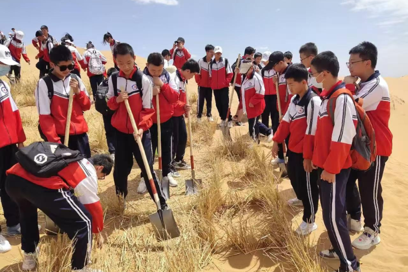 组织学生在沙坡头景区开展学习扎设麦草方格实践活动