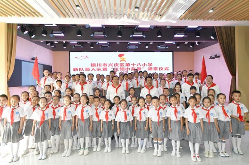 6月1日,梁言顺、张雨浦等领导来到银川市兴庆区第十八小学,与参加学校少先队集中入队仪式的少先队员合影留念。
