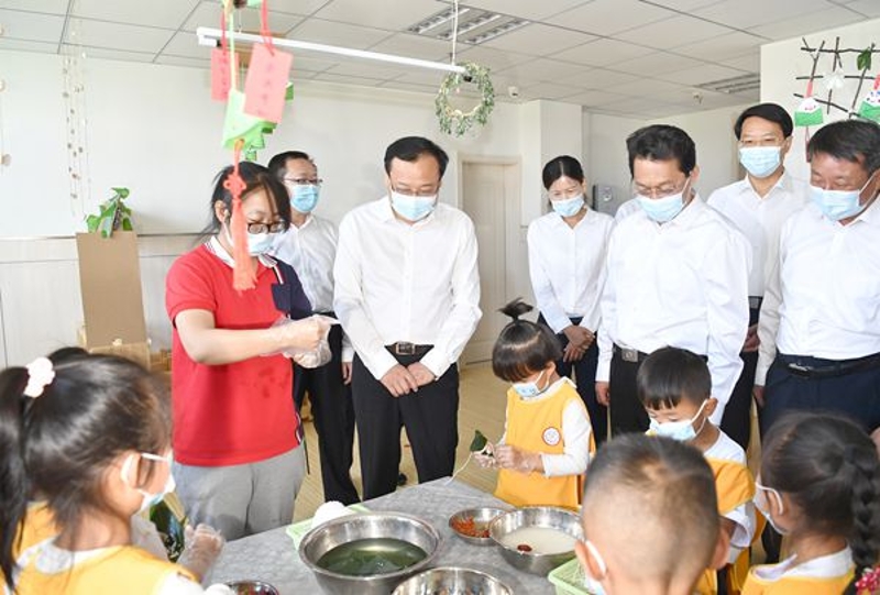 贺兰县第四幼儿园是全县最大的公办农村幼儿园,近年来坚持游戏化和体验式保教,努力打造融入自然、回归生态的儿童乐园。操场上,孩子们正在兴致勃勃地参与绘彩蛋、佩香囊、点朱砂等端午节活动和“小红军向前冲”等游戏。梁言顺、张雨浦走到孩子们中间送上节日祝福,孩子们开心地把自己编织的彩绳戴到他们手上。“每个人都是从孩子长大的,弘扬中华优秀传统文化、传承红色基因血脉,就要从娃娃抓起,系好人生第一粒扣子。”梁言顺对幼儿园的教育理念和方式给予肯定。走进生活体验室,看到孩子们有模有样地包粽子、煮奶茶、蒸艾草、做水果沙拉,梁言顺叮嘱幼儿园老师,要把劳动最光荣、劳动最美丽的种子播进孩子们心间,让他们从小懂得劳动才能播种希望、收获果实,真正爱劳动、会生活。