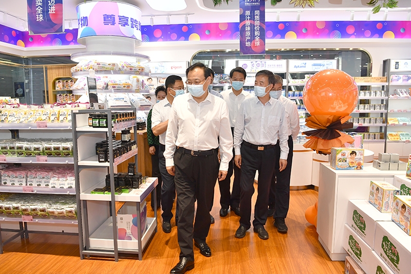 6月7日,梁言顺等领导来到银川综合保税区,察看跨境O2O体验中心的进出口产品展示。