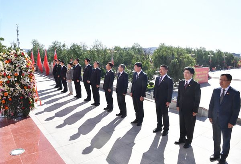 6月15日,梁言顺带领新一届自治区党委常委班子,来到西吉县将台堡红军长征会师纪念园,集体向纪念碑鞠躬行礼。
