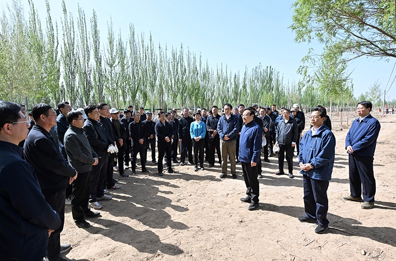 4月26日上午,自治区党委书记、人大常委会主任梁言顺在永宁县杨和镇植树点,与区直机关、银川市干部职工代表一起挥锹铲土,参加全民义务植树活动。