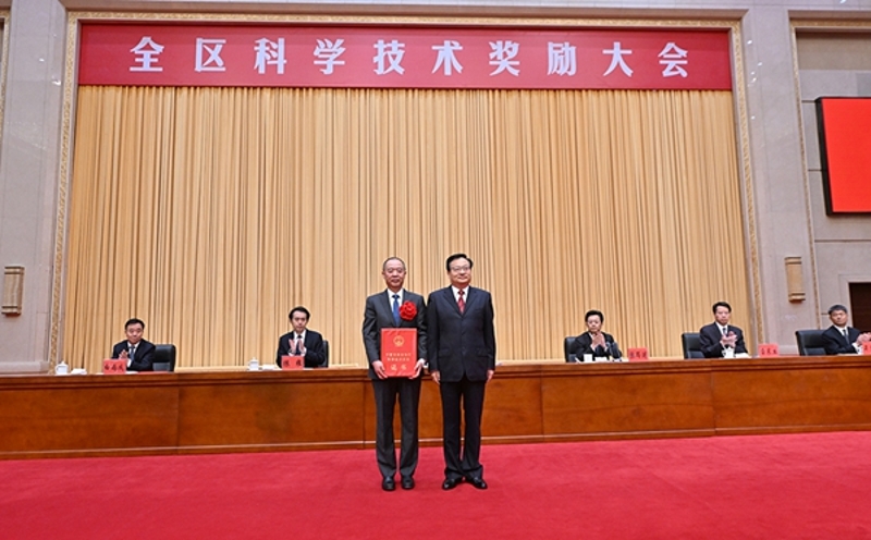 自治区科学技术进步一等奖获奖代表上台领奖。