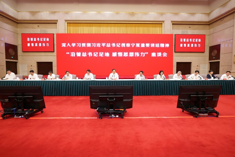 7月19日,自治区党委召开深入学习贯彻习近平总书记视察宁夏重要讲话精神“沿着总书记足迹 感悟思想伟力”座谈会,自治区党委书记、人大常委会主任梁言顺出席会议并讲话,强调要坚持以习近平新时代中国特色社会主义思想为指导,深入学习贯彻总书记视察宁夏重要讲话指示批示精神,感悟思想伟力,凝聚奋进共识,坚定不移沿着总书记指引的方向勇毅前行,奋力谱写全面建设社会主义现代化美丽新宁夏的壮丽篇章。自治区党委副书记、自治区主席张雨浦主持。自治区政协主席陈雍,主题教育中央第十五指导组副组长邵林出席。