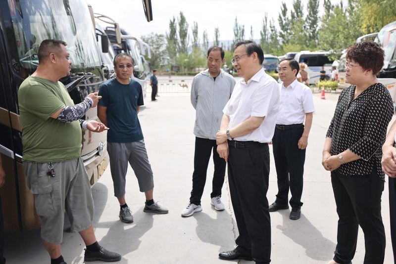 8月9日,梁言顺在沙坡头旅游集散地,实地了解旅游市场安全治理、旅游交通安全责任落实等情况,与正在候客的大巴车司机攀谈。