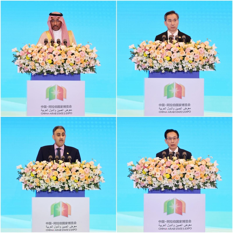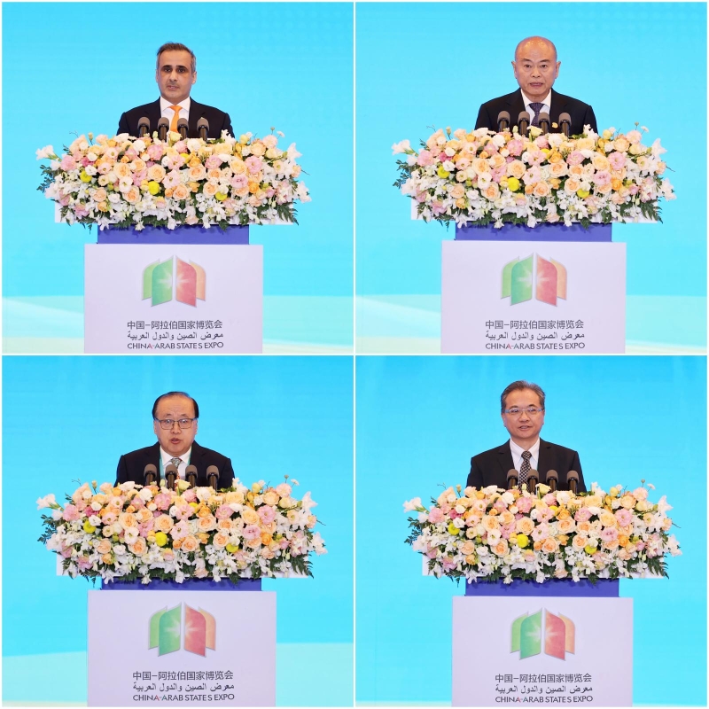 沙特工业和矿产资源部大臣班达尔·胡莱夫,中国贸促会会长任鸿斌,阿拉伯国家联盟助理秘书长阿里·本·伊卜拉欣·马利克,广东省政协副主席黄武(从左至右、从上至下)分别致辞。