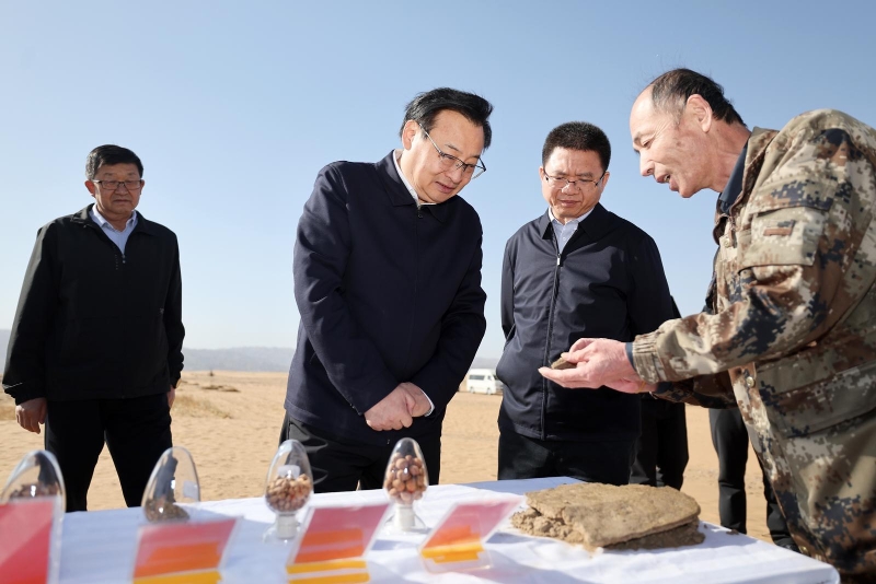 3月28日,梁言顺在中卫市固沙锁边示范项目现场,察看示范点建设和防沙治沙成果。