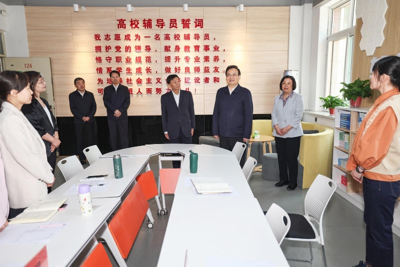 随后,梁言顺走进学生事务服务中心,听取“我为同学办实事”项目实施情况介绍,观看“一站式”平台服务流程展示,与辅导员深入交流。他说,我大学毕业后留校当了6年政治辅导员,有着很深的情结,深感这项工作非常重要、很有意义。辅导员是青年学生的重要人生导师,要在朝夕相处中做好学生思想教育和心理疏导工作,在成长成才的关键时、要紧处帮一下,多指路子、打开“心结”,引导他们坚定理想信念、树立远大志向。
