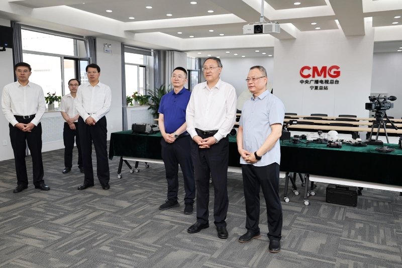 8月20日,李邑飞在中央广播电视总台宁夏总站多功能演播区,了解媒体融合发展情况。