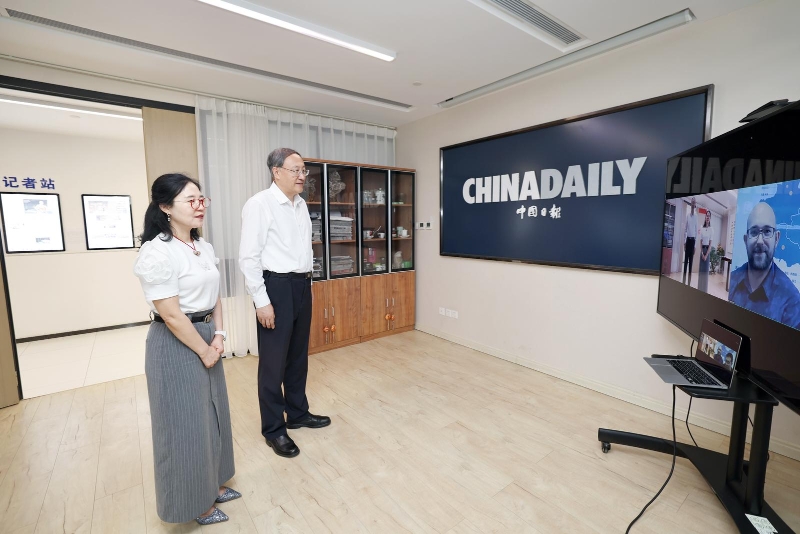 8月20日,李邑飞在中国日报社宁夏记者站,与外籍记者视频连线交流。