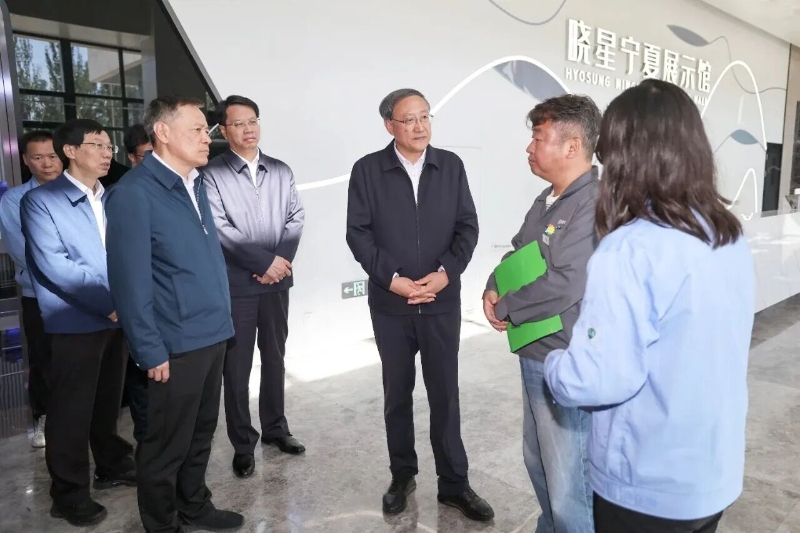 李邑飞在晓星氨纶(宁夏)有限公司,调研企业生产经营情况。