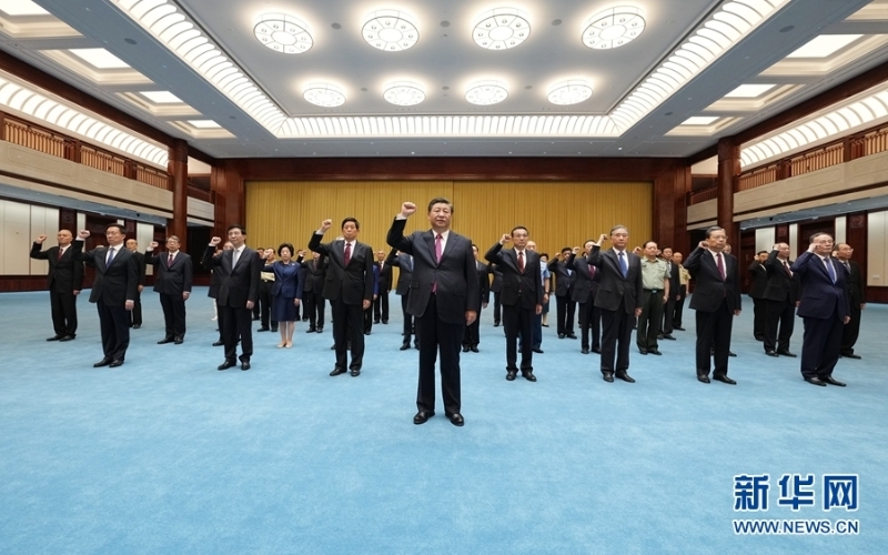 参观结束后,习近平等党员领导同志来到党史展览馆红色大厅。面向鲜红的中国共产党党旗,习近平举起右拳,带领领导同志重温入党誓词,铿锵有力的宣誓声响彻大厅。