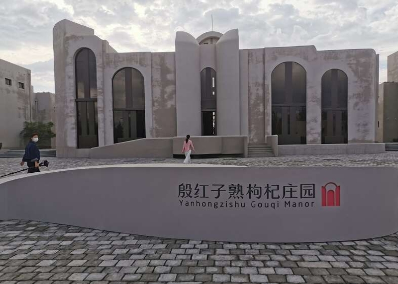 “殷红子熟”源自唐代著名诗人刘禹锡《题枸杞井》诗中“翠黛叶生笼石甃 ,殷红子熟照铜瓶”。殷红子熟枸杞庄园总占地面积1500亩,遵循“敬天爱人,回归自然”的设计理念,将贺兰山、枸杞园与建筑艺术结合,如今已成为贺兰山东麓新的枸杞主题公园和网红打卡地。