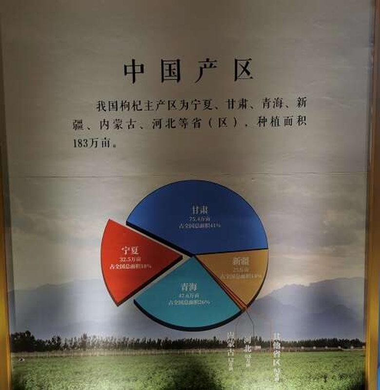 宁夏回族自治区林业和草原局、国家林业和草原局发展研究中心编写的中国枸杞产业蓝皮书——《中国现代枸杞产业高质量发展报告(2024)》(以下简称《报告》)公布的数据显示:据不完全统计,截至2023年年底,全国枸杞种植面积183万亩(1亩≈667平方米)。其中,甘肃 75.4万亩、青海47.6万亩、宁夏32.5万亩、新疆25万亩、内蒙古1.2万亩、河北0.8 万亩、其他省区0.5万亩,分别占到全国的41.2%、26.0%、17.7%、13.7%、0.7%、 0.4%、0.3%。鲜果产量140万吨左右,加工转化率20%,干果产量24.0万吨。全国现代枸杞产业带动近50万农户、400余万人从业,主产基地县农民平均经营性收入的 50%来自枸杞。