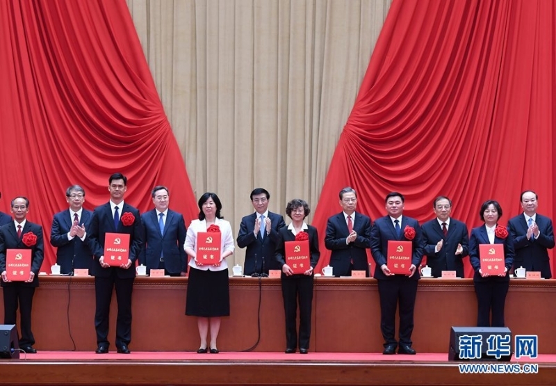 6月28日,全国“两优一先”表彰大会在北京人民大会堂举行。这是中共中央政治局常委、中央书记处书记王沪宁,中共中央政治局常委、中央纪委书记赵乐际等为受表彰的个人和集体代表颁奖。新华社记者 张领 摄