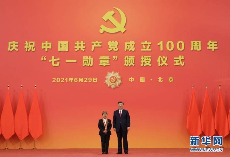6月29日,庆祝中国共产党成立100周年“七一勋章”颁授仪式在北京人民大会堂金色大厅隆重举行。中共中央总书记、国家主席、中央军委主席习近平向“七一勋章”获得者李宏塔颁授勋章。新华社记者 李学仁 摄