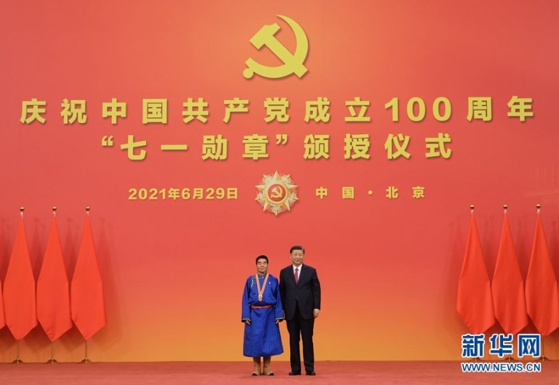 6月29日,庆祝中国共产党成立100周年“七一勋章”颁授仪式在北京人民大会堂金色大厅隆重举行。中共中央总书记、国家主席、中央军委主席习近平向“七一勋章”获得者廷·巴特尔颁授勋章。新华社记者 李学仁 摄